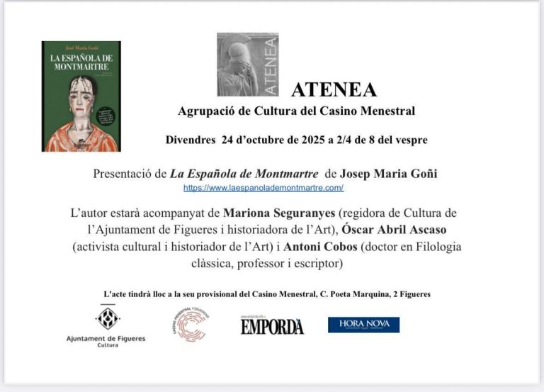 Intervienen: Mariona Seguranyes (Regidora de Cultura del Ayuntamiento de Figueras e historiadora de Arte, Antoni Cobos (Doctor en Filología clásica, profesor y escritor, José María Goñi (autor del libro)